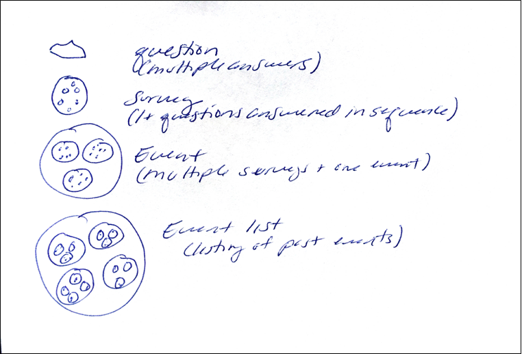 As more evidence of the app being more complicated than the client was aware, while designing the archive section, the client and I kept getting confused over the names for the different layers of content, and how the user would need or want to access it. As a visual thinker, I did this little sketch to help me understand the layers, and to give us a common lexicon of what each layer would be called, so we could be on the same page. Food metaphors rarely fail. Each question was like a chocolate chip. A survey was a chocolate chip cookie. An event was a plate of chocolate chip cookies, and an event list was like a bake sale of different plates of cookies. This mutual understanding helped me to design the archive section.