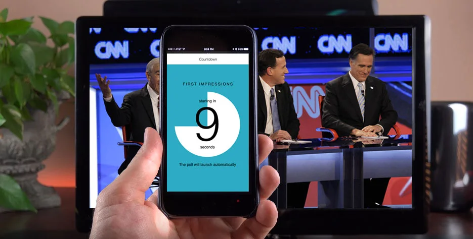 Each polling question has a limited time window in which it can be answered. In order to convey that visually to the user as simply as possible, without having more text on the screen, I designed the time remaining to be shown graphically with a color bar gradually filling the screen. This way the user could know how much time they have left without having to remove their eyes from the content.